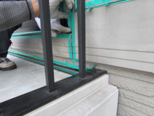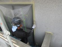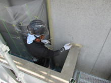 本日の作業は弾性セラミクリーン中塗り。今日は南面のベランダ付近を施工しています。狭い部分は先に刷毛で色を入れていきます。