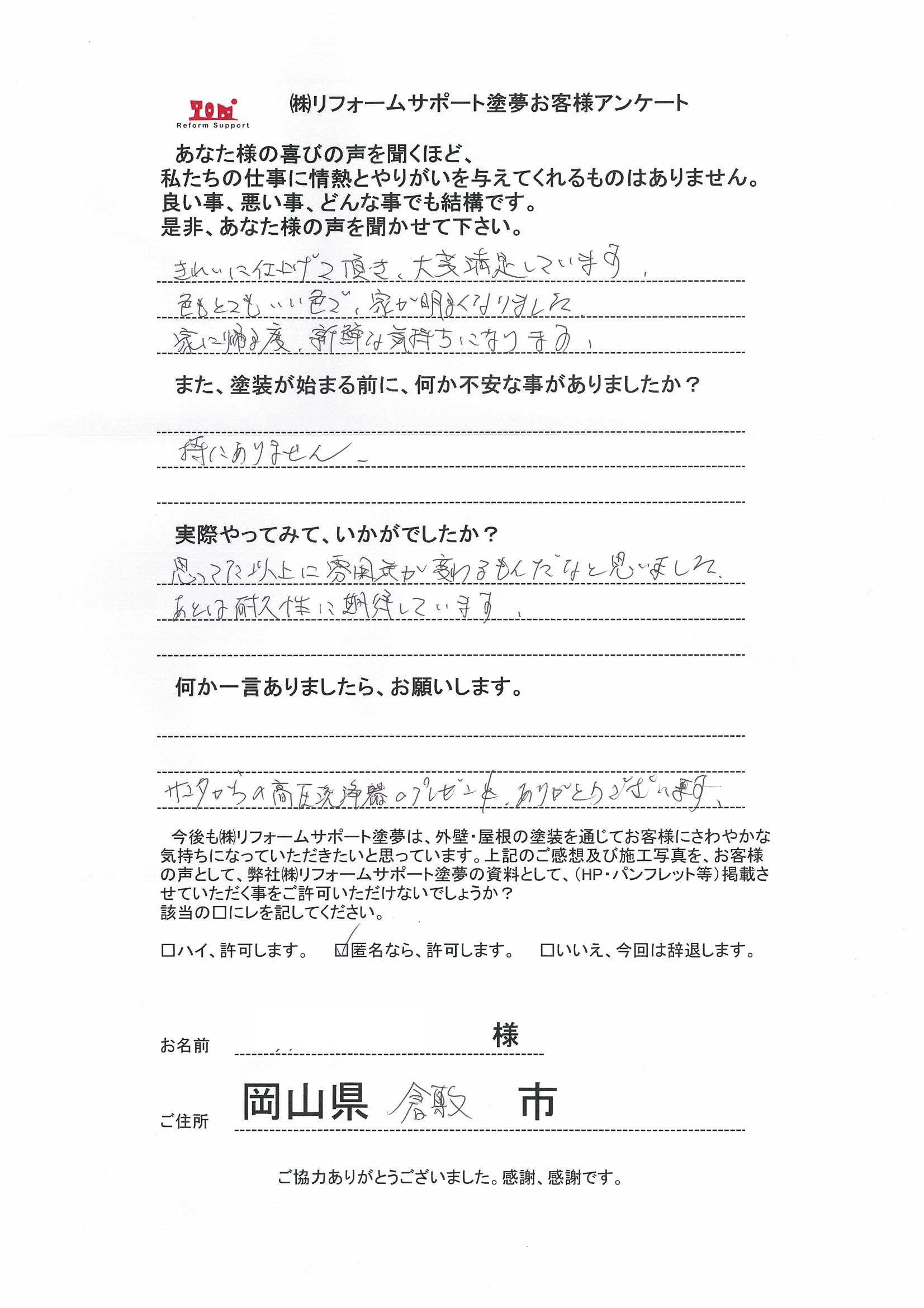 倉敷市屋根も外壁も高耐久無機で塗装されたお客様の声